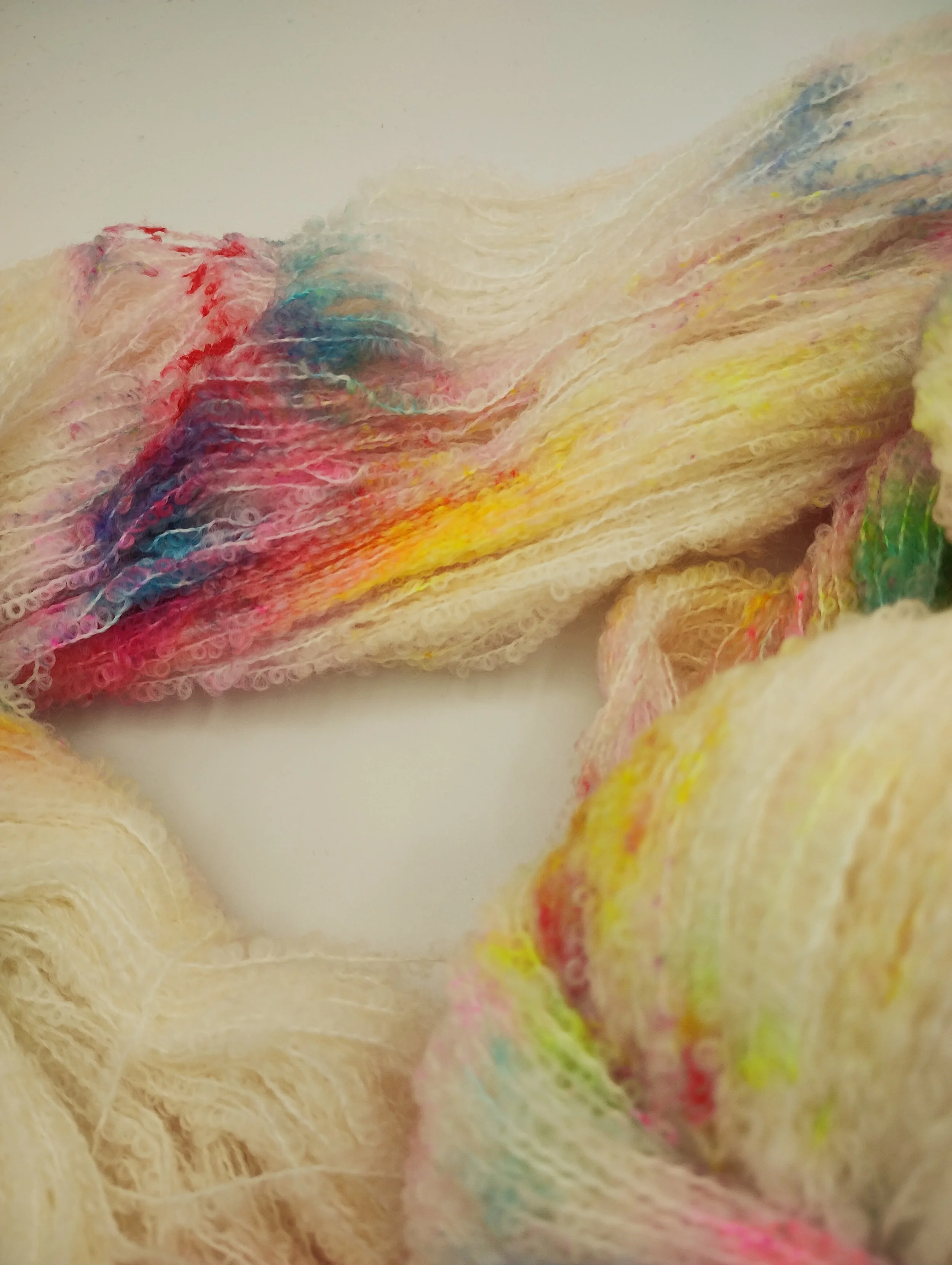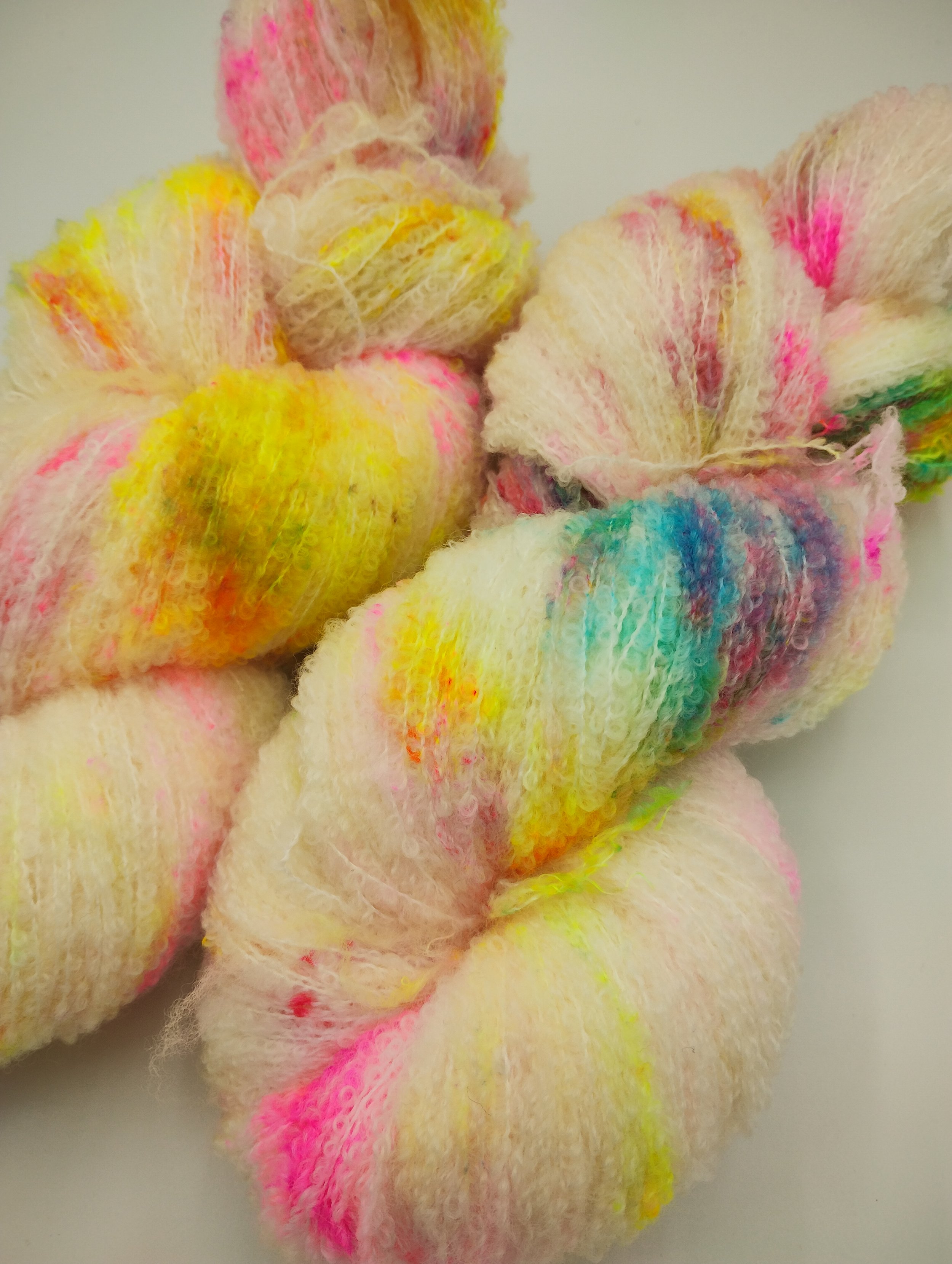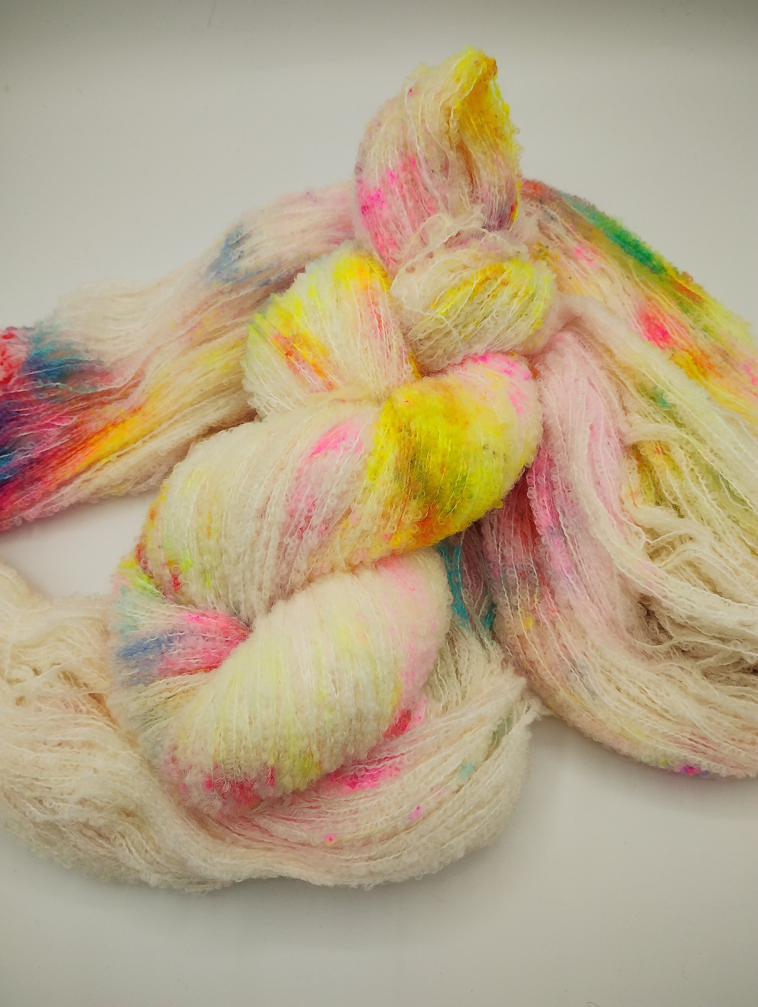 Super – soft merino spun around a nylon core for strength and durability to give a light and bouncy laceweight yarn which knits to a DK gauge on its own or 0n 4.5 – 5mm needles when held with a strand of 4-ply. Great for adding warmth without weight, as the boucle loops trap warm air next to skin.