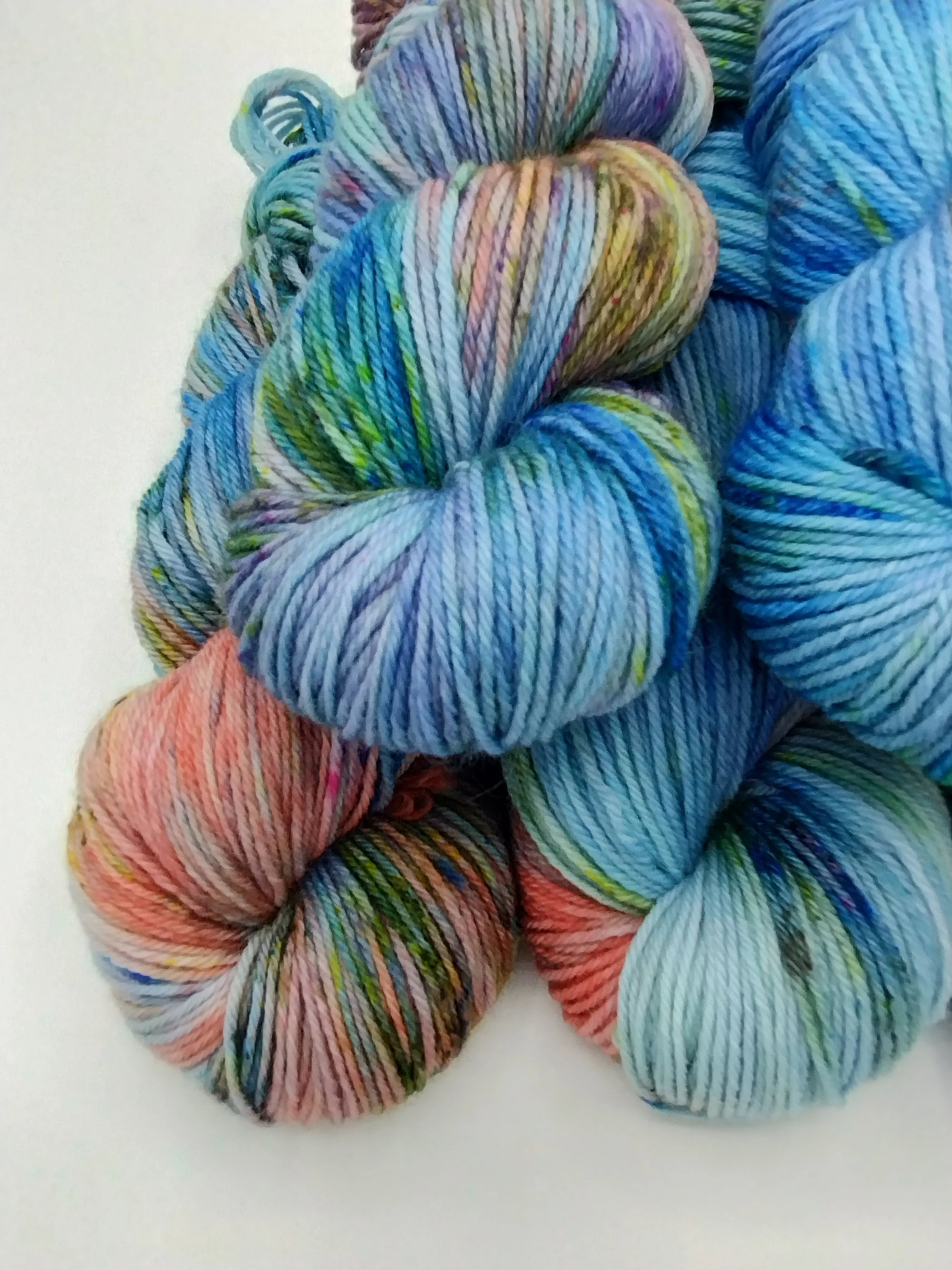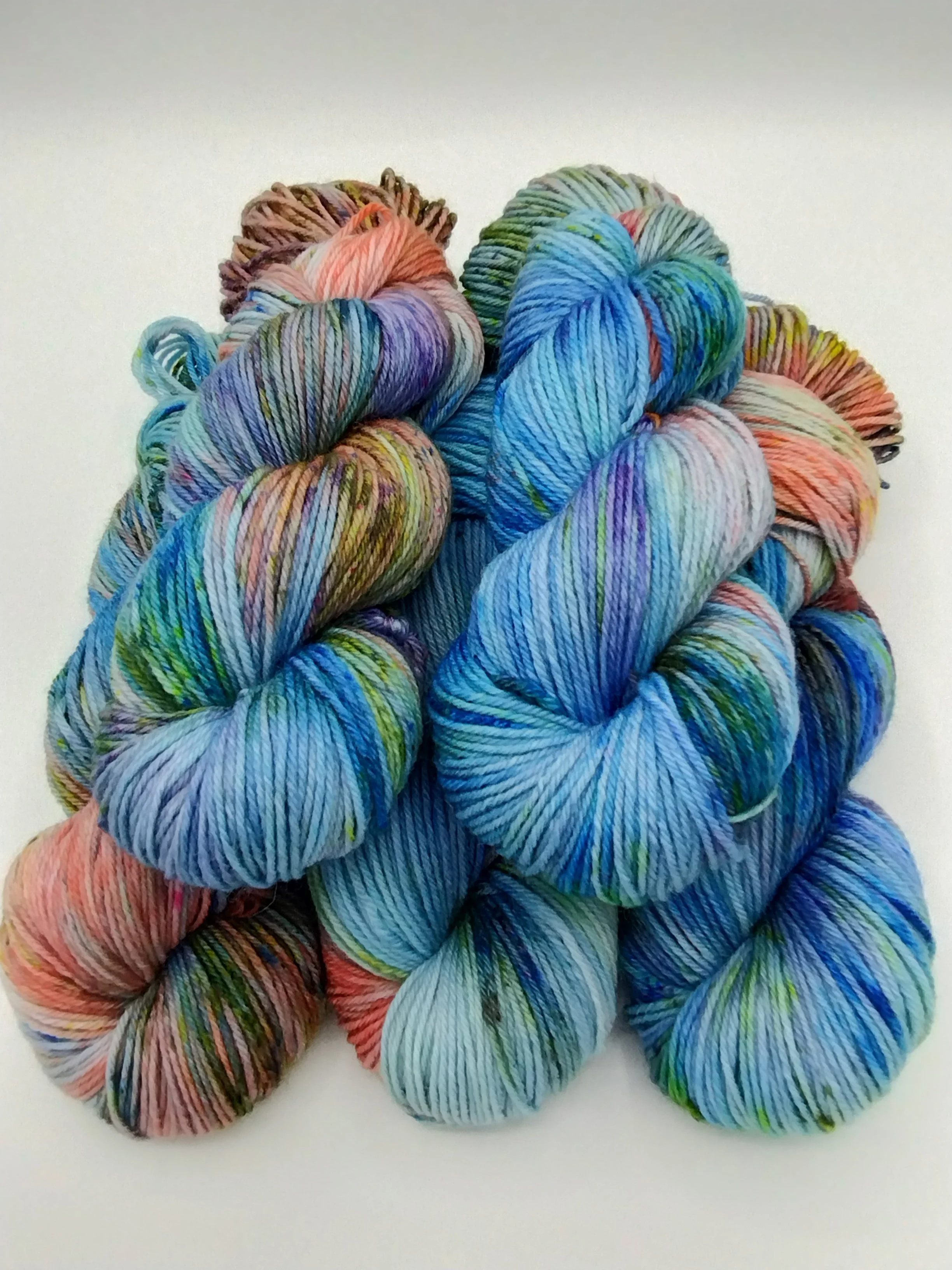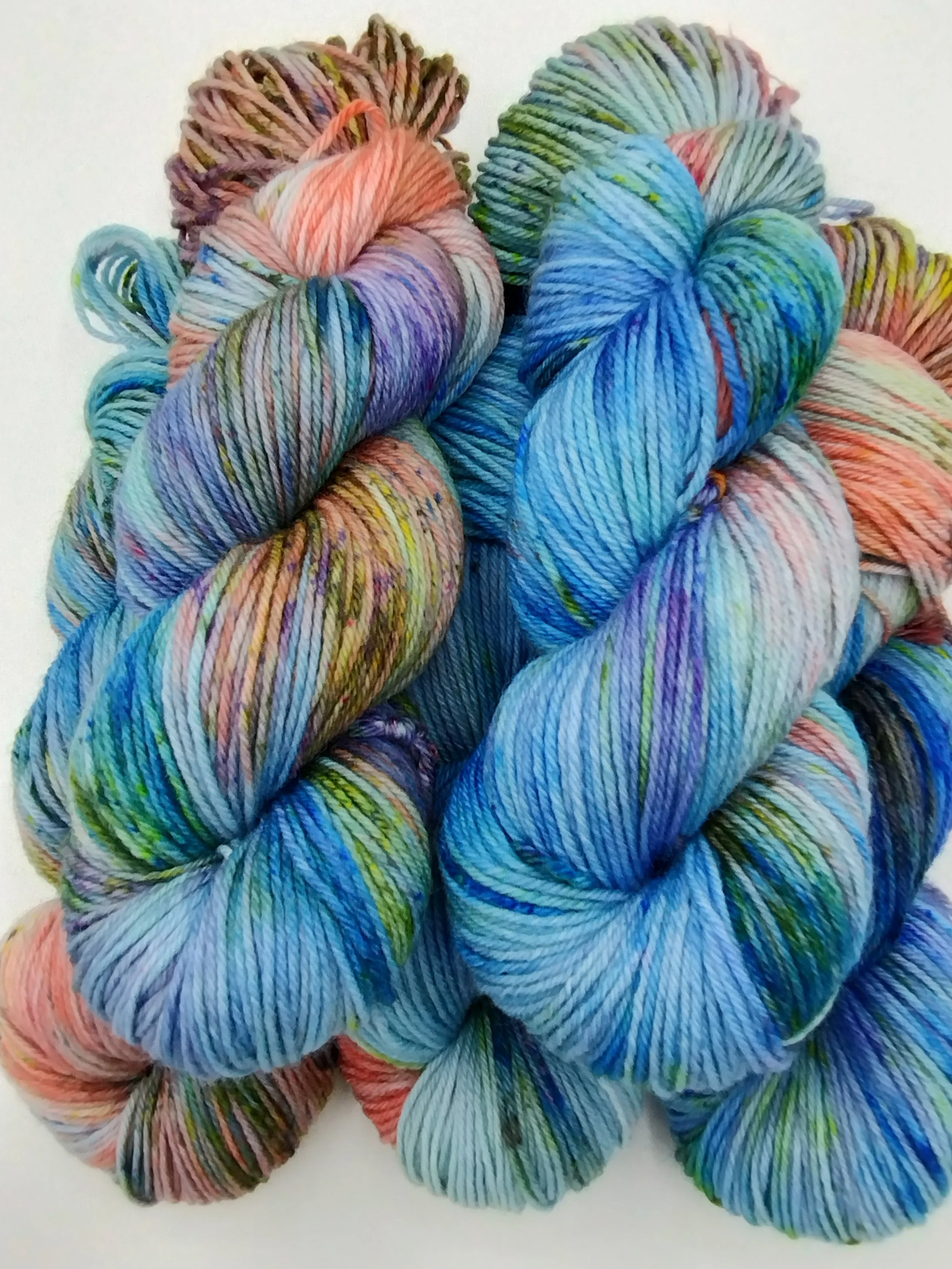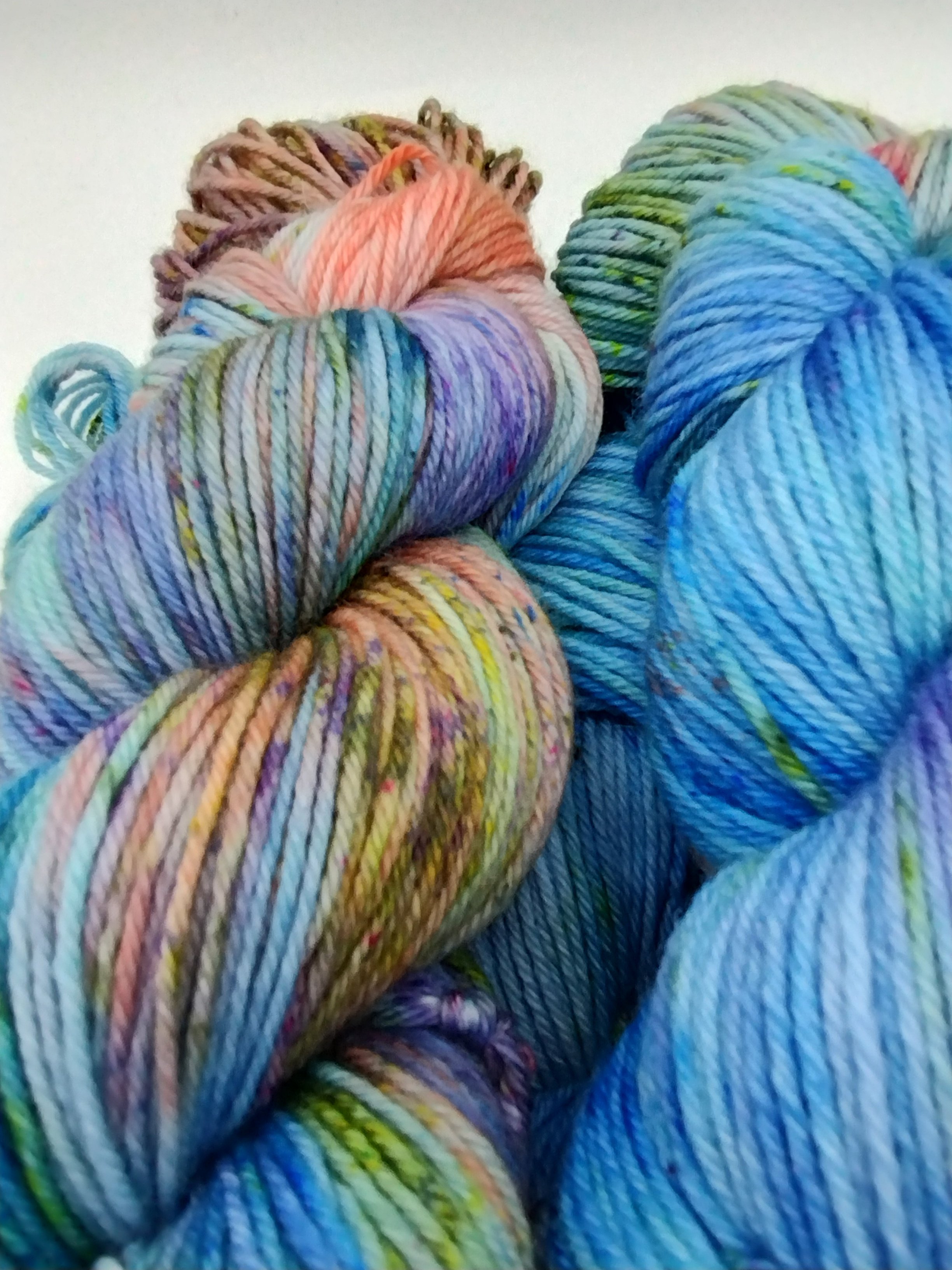 All my yarns are dyed to exhaust in the dyebath and thoroughly rinsed. Some shades, particularly hot pinks and blues, can release a little bit of colour when wet. Always swatch for colourfastness before committing to knit two different yarns together to avoid surprises.