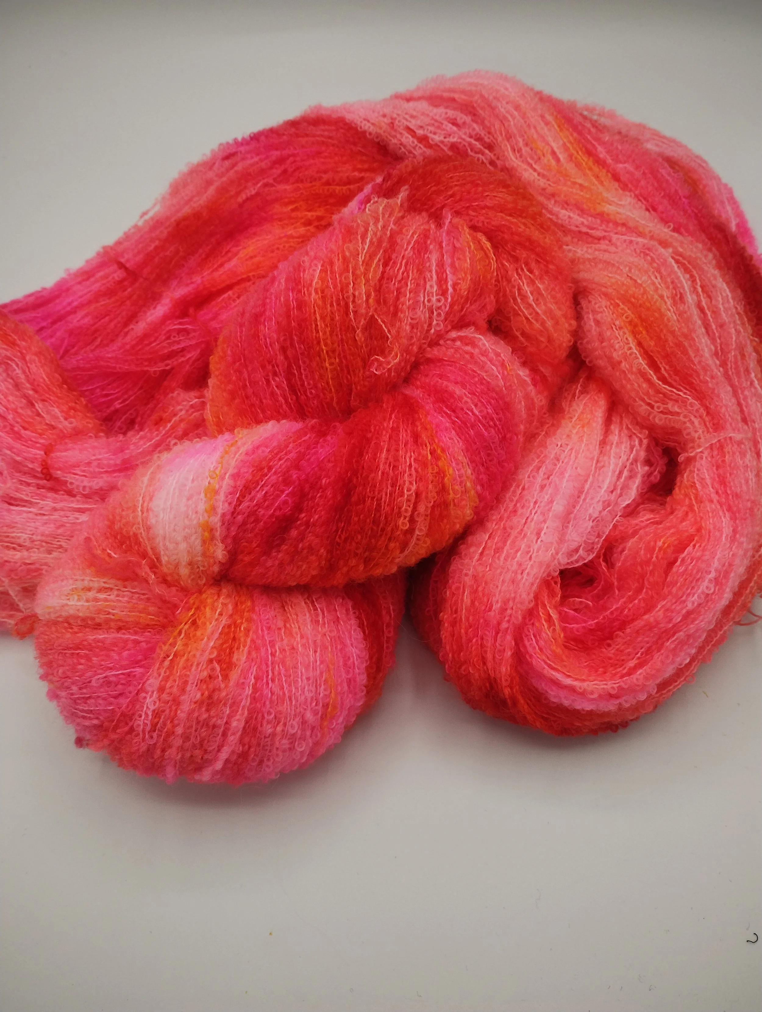 Super – soft merino spin around a nylon core for strength and durability to give a light and bouncy laceweight yarn which knits to a DK gauge on its own or 0n 4.5 – 5mm needles when held with a strand of 4-ply. Great for adding warmth without weight, as the boucle loops trap warm air next to skin.