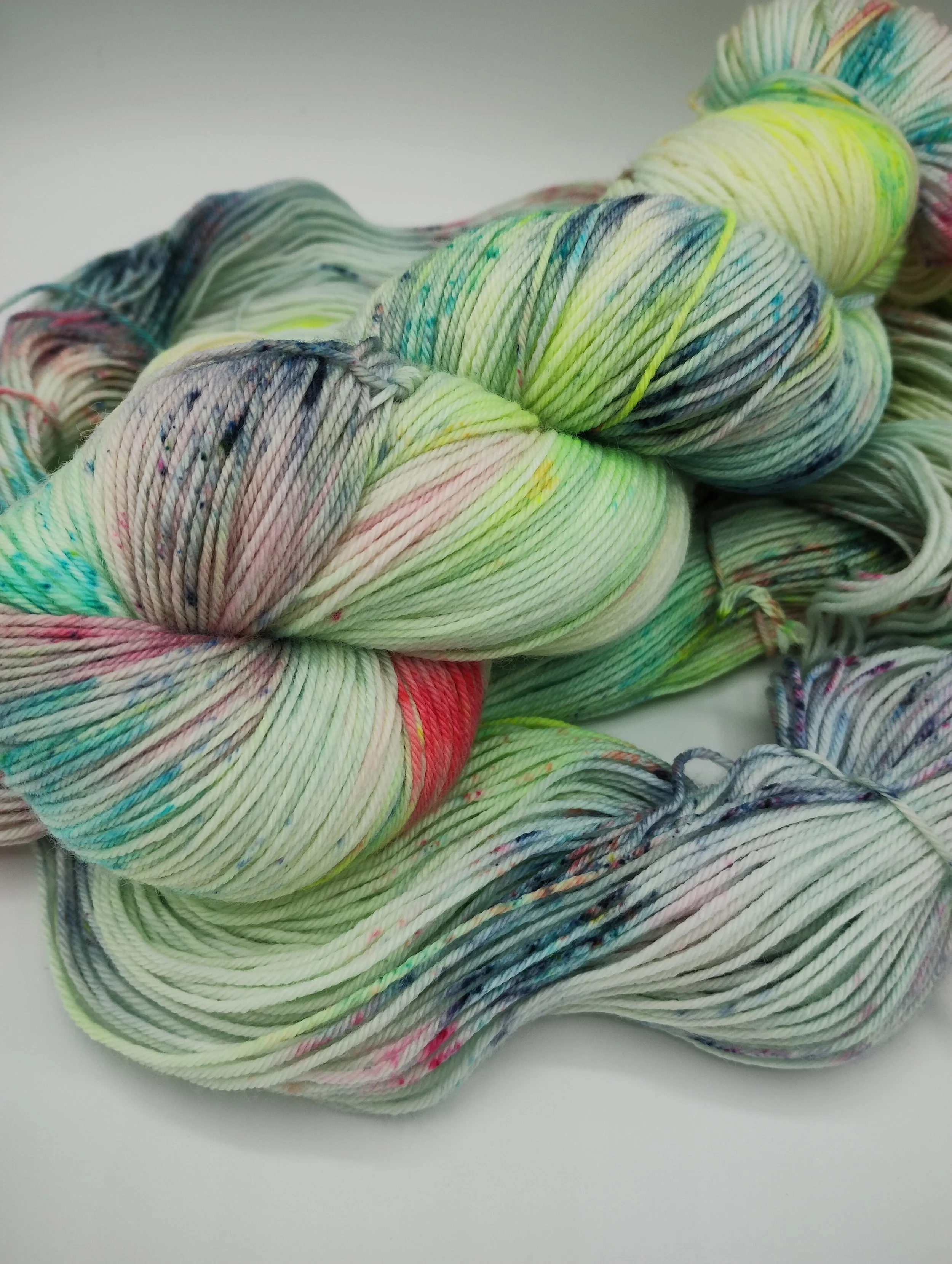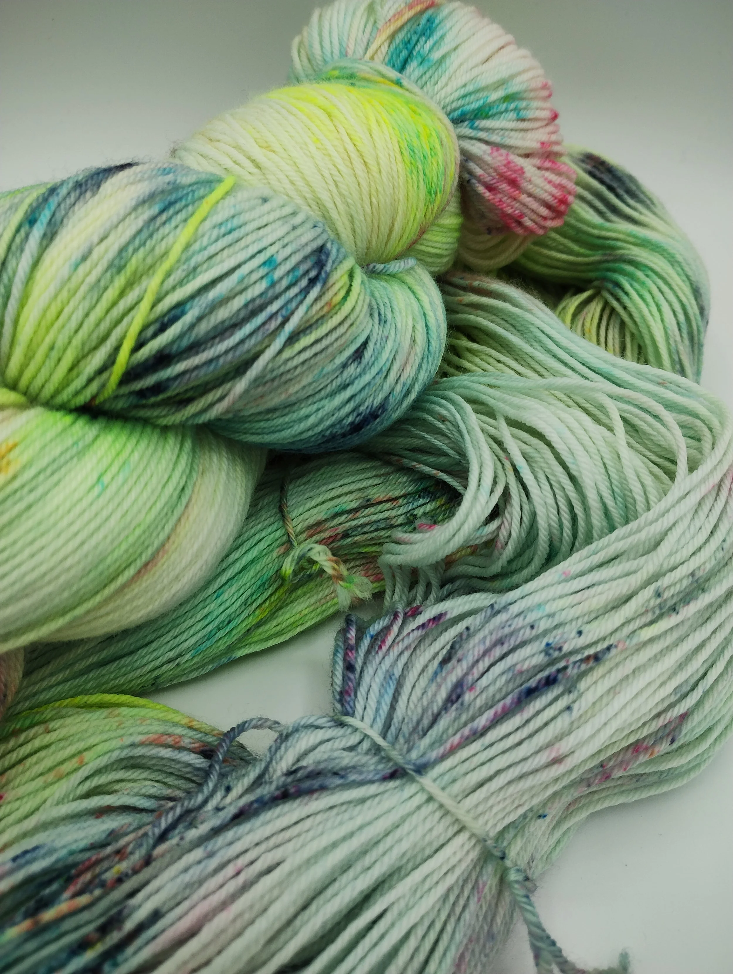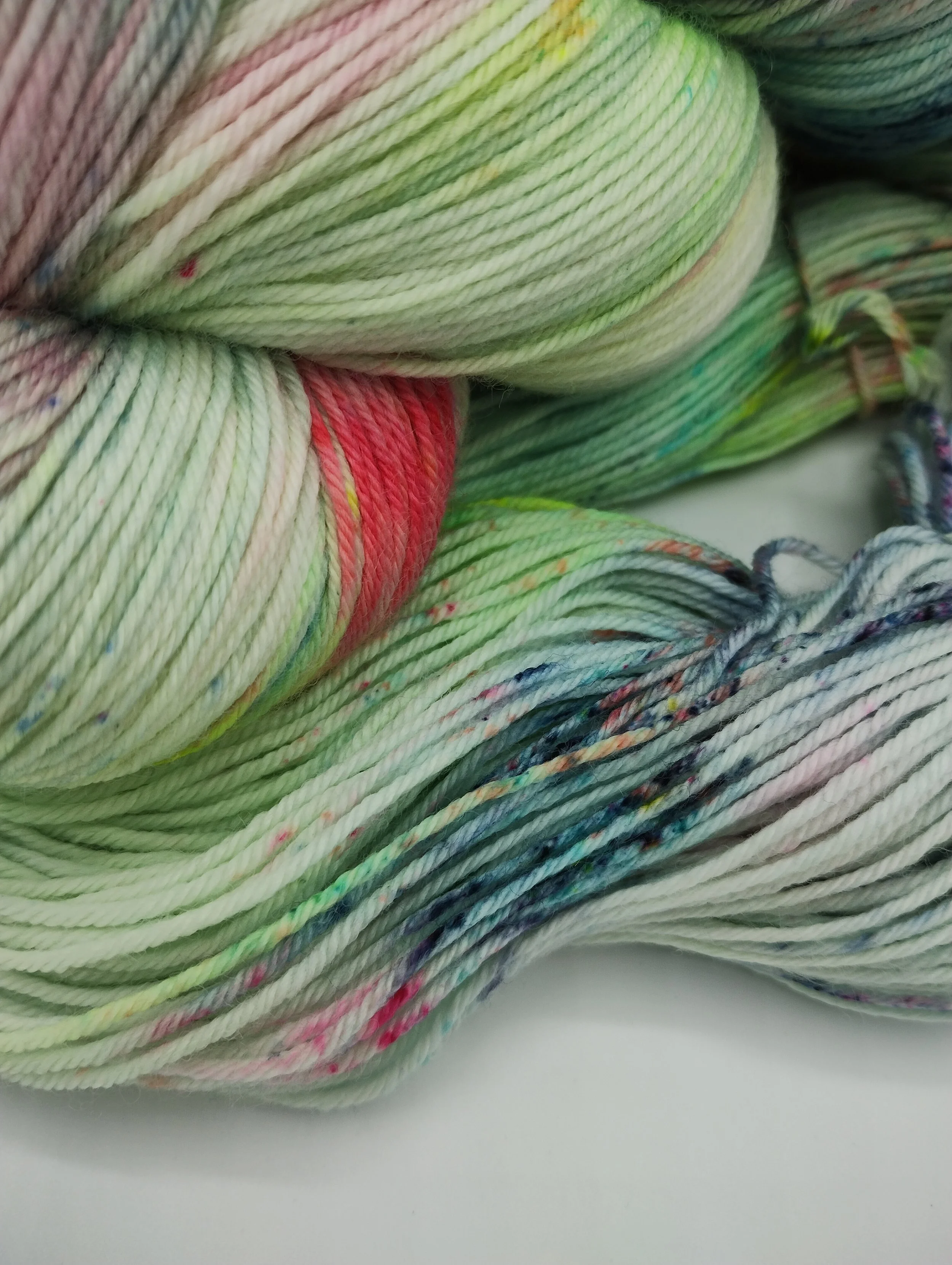 All my yarns are dyed to exhaust in the dyebath and thoroughly rinsed. Some shades, particularly hot pinks and blues, can release a little bit of colour when wet. Always swatch for colourfastness before committing to knit two different yarns together to avoid surprises.