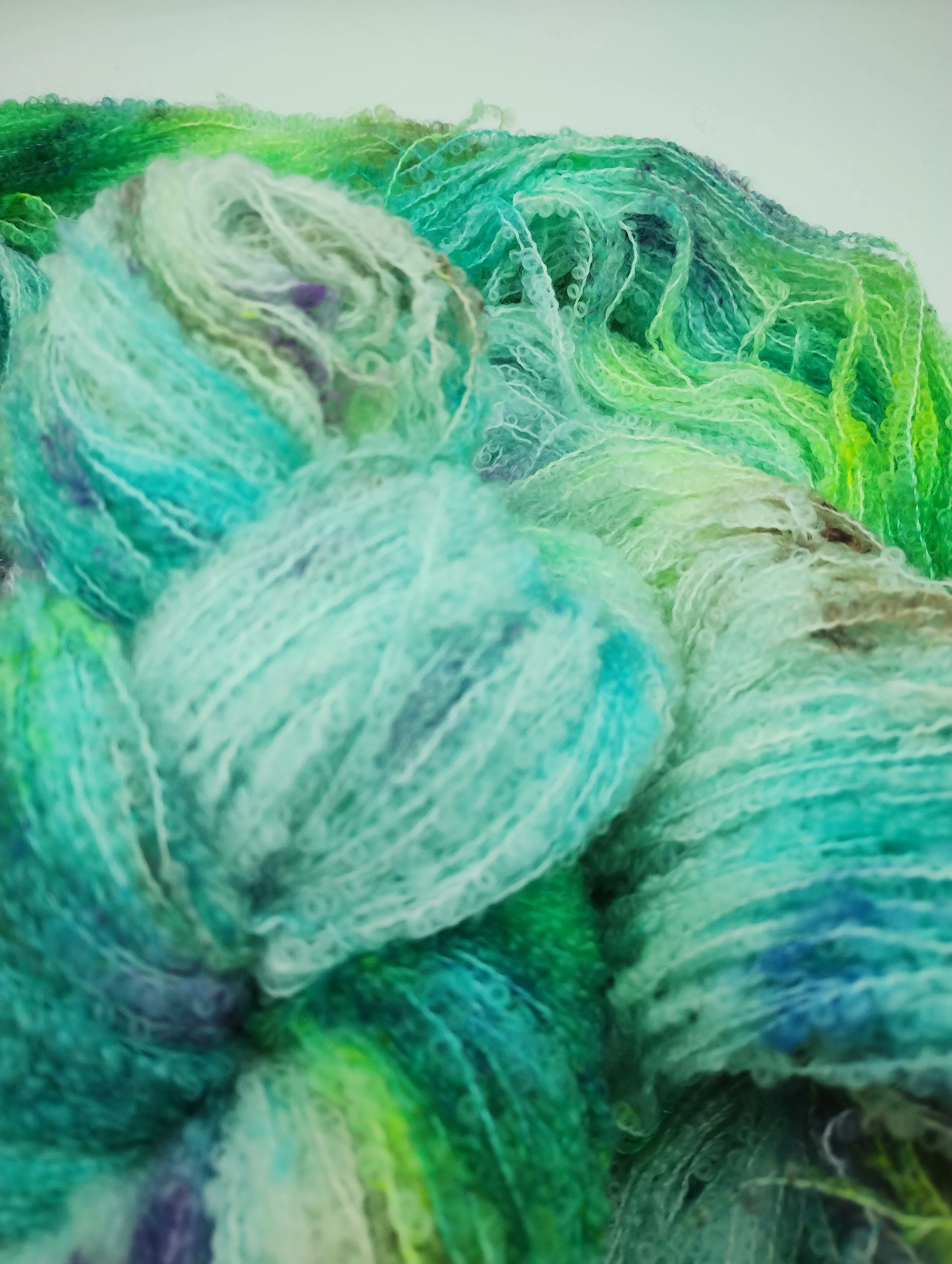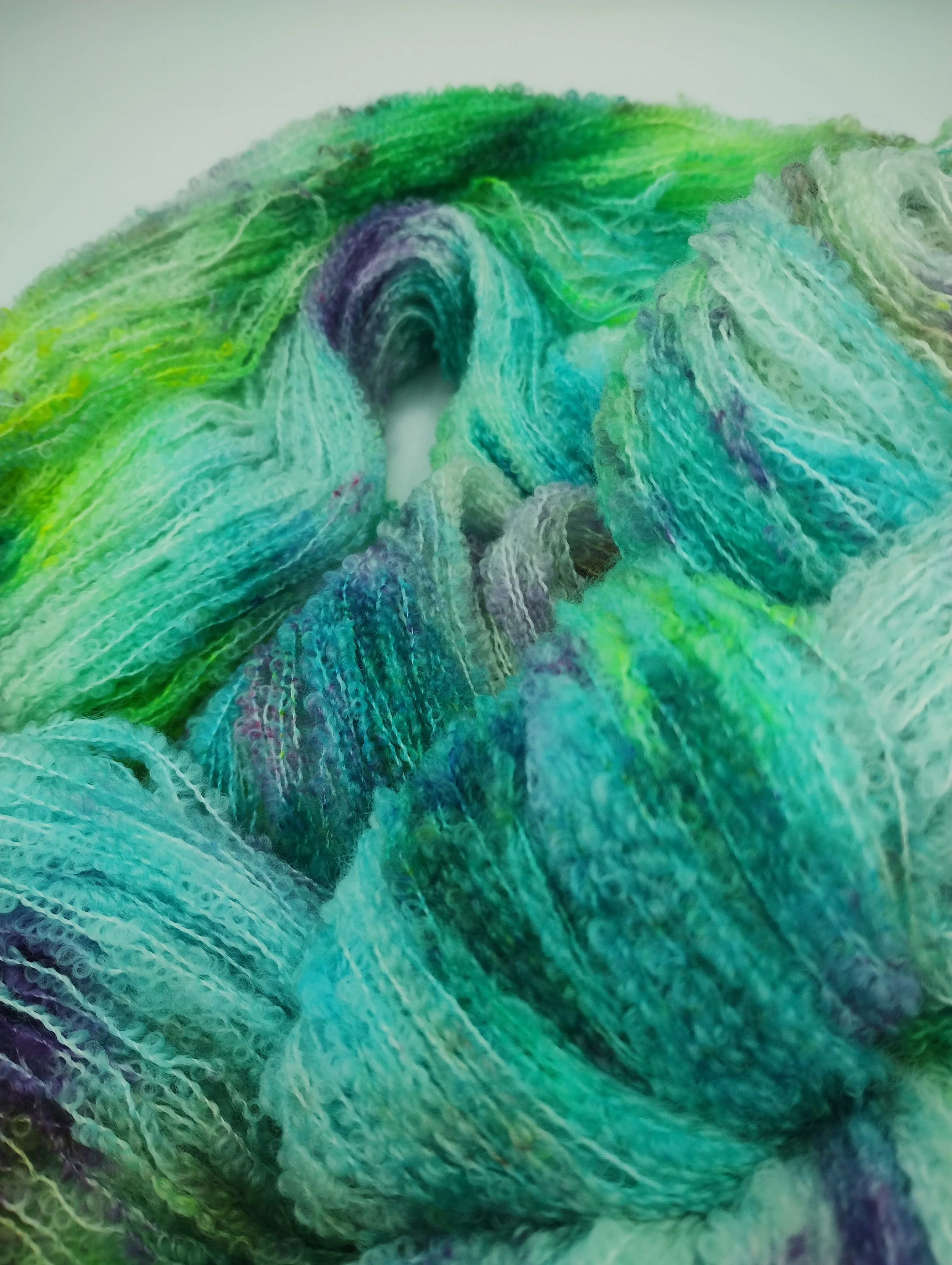 Super – soft merino spun around a nylon core for strength and durability to give a light and bouncy laceweight yarn which knits to a DK gauge on its own or 0n 4.5 – 5mm needles when held with a strand of 4-ply. Great for adding warmth without weight, as the boucle loops trap warm air next to skin.