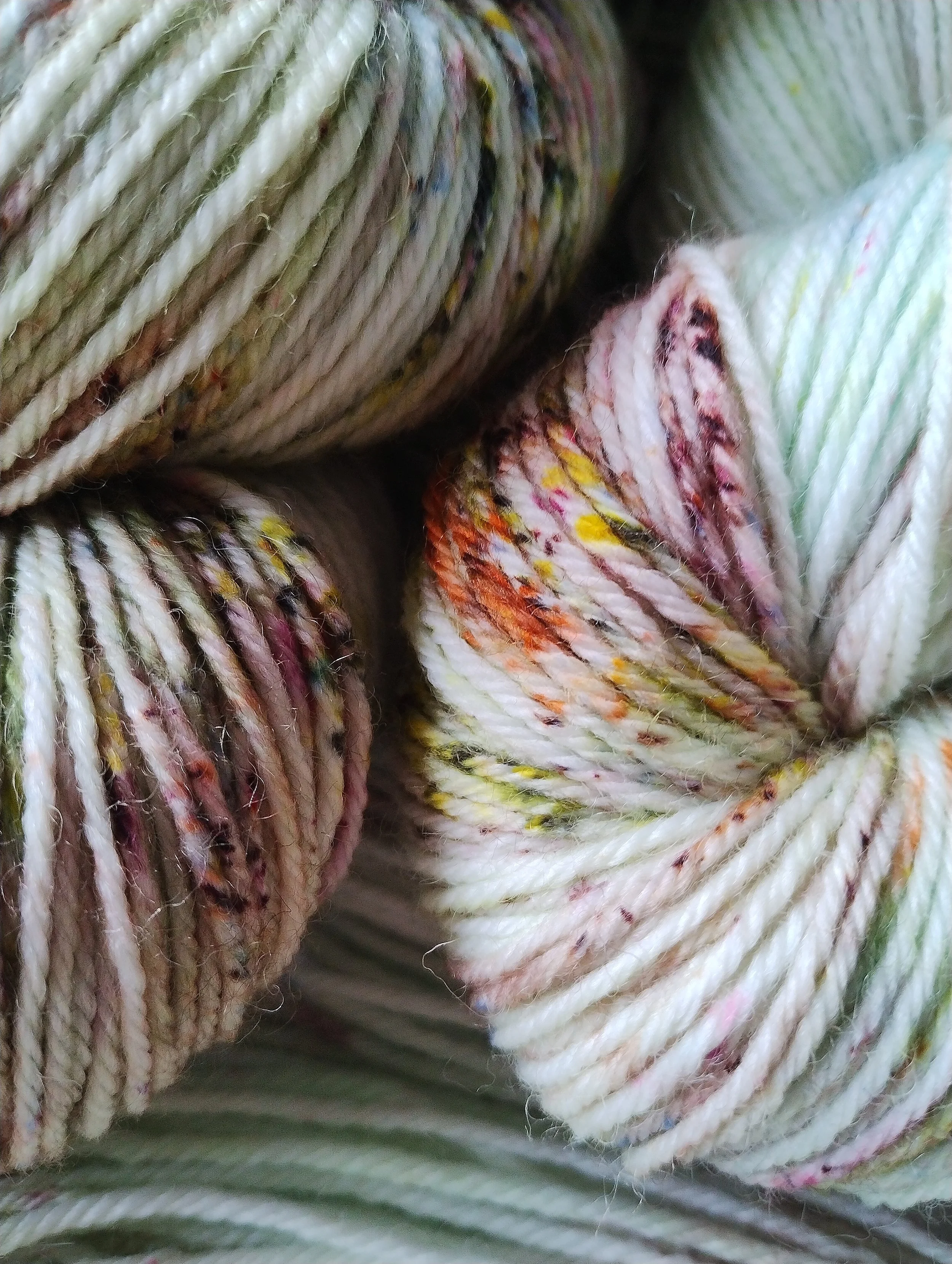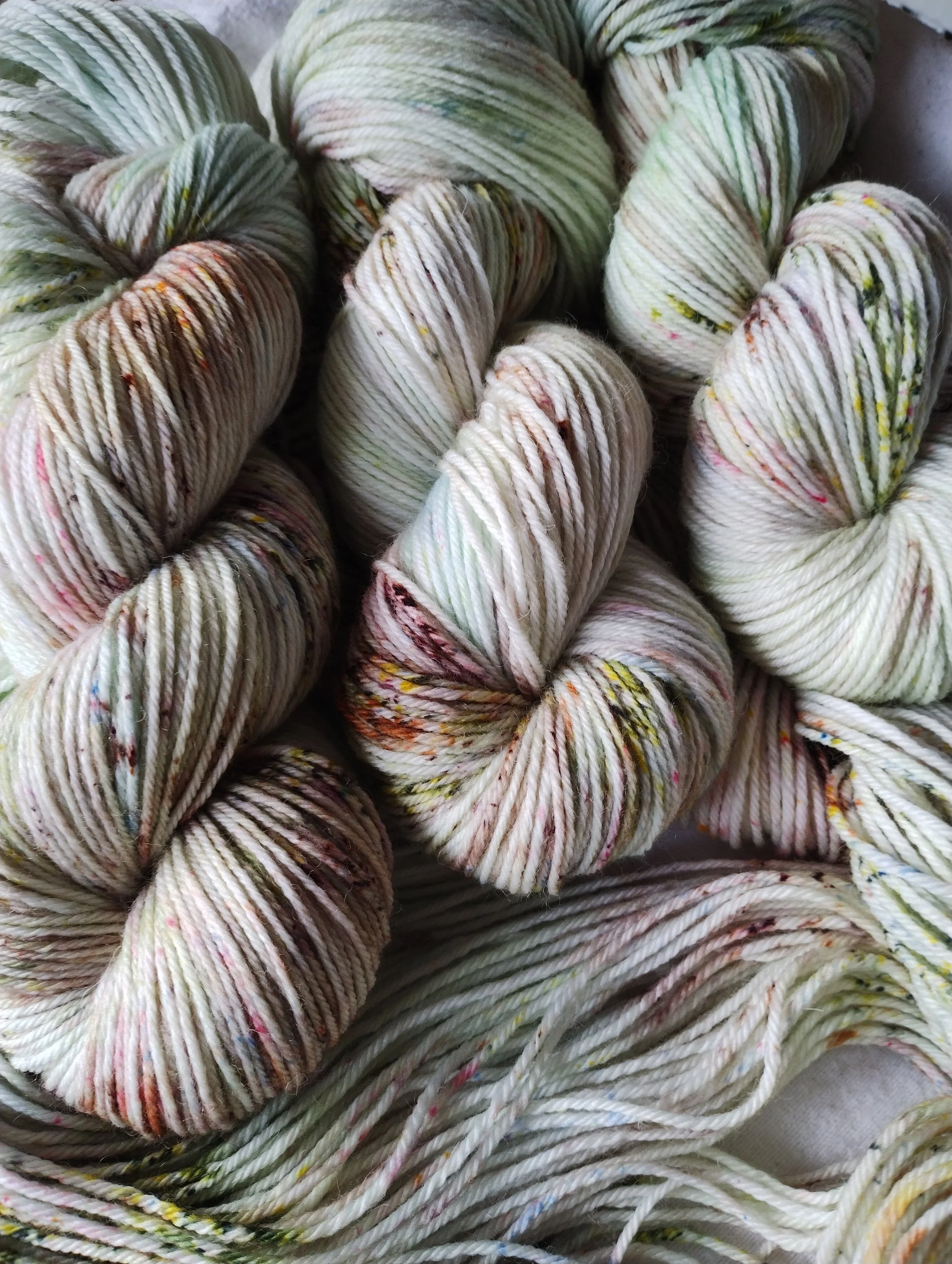 A bouncy, durable but still soft all round sock yarn. This one has a bit more of a traditional lambswool handle but is still suitable for next to skin wear. A perennial favourite, it takes colour well and gives crisp stitch and speckle definition.