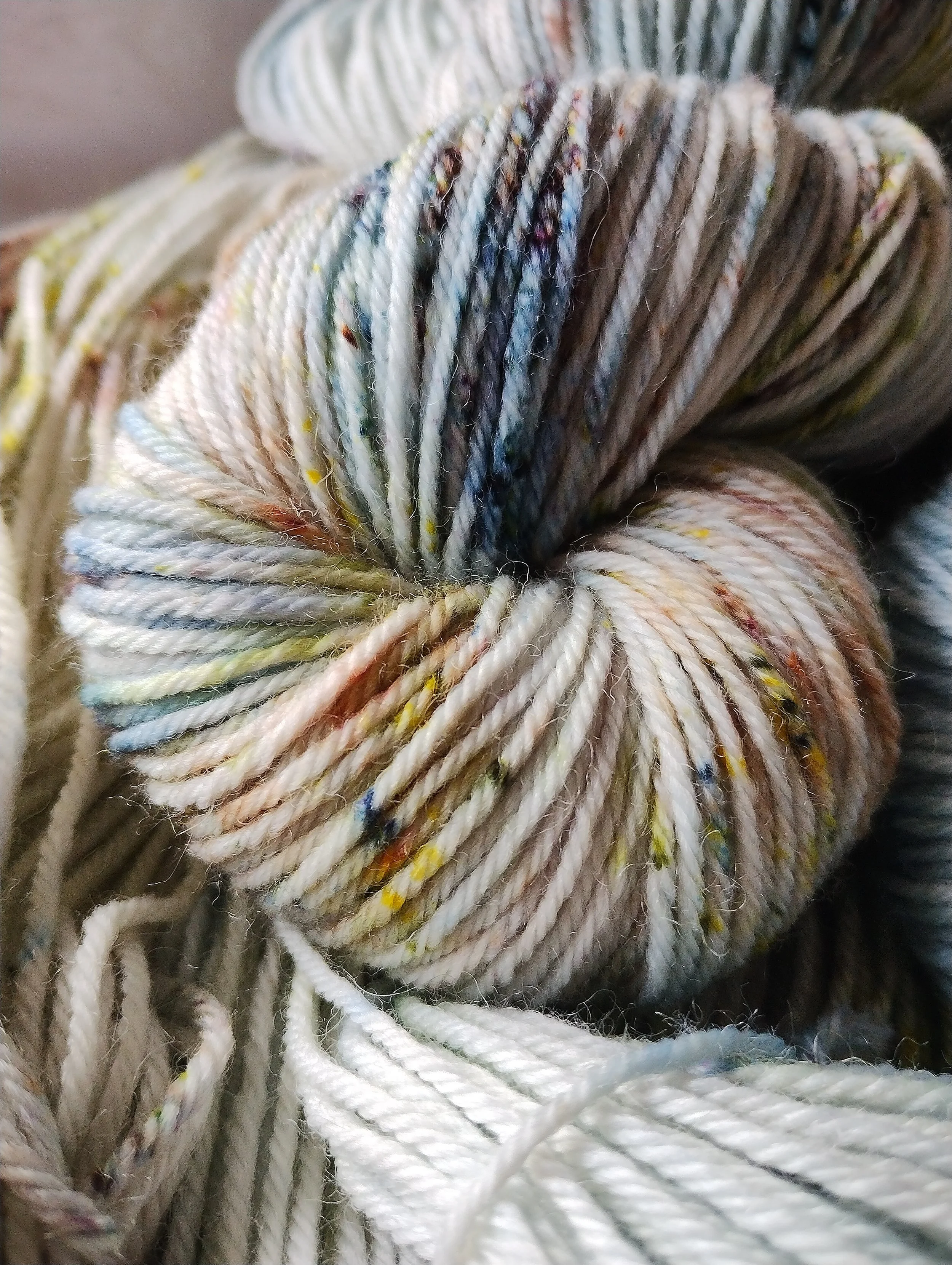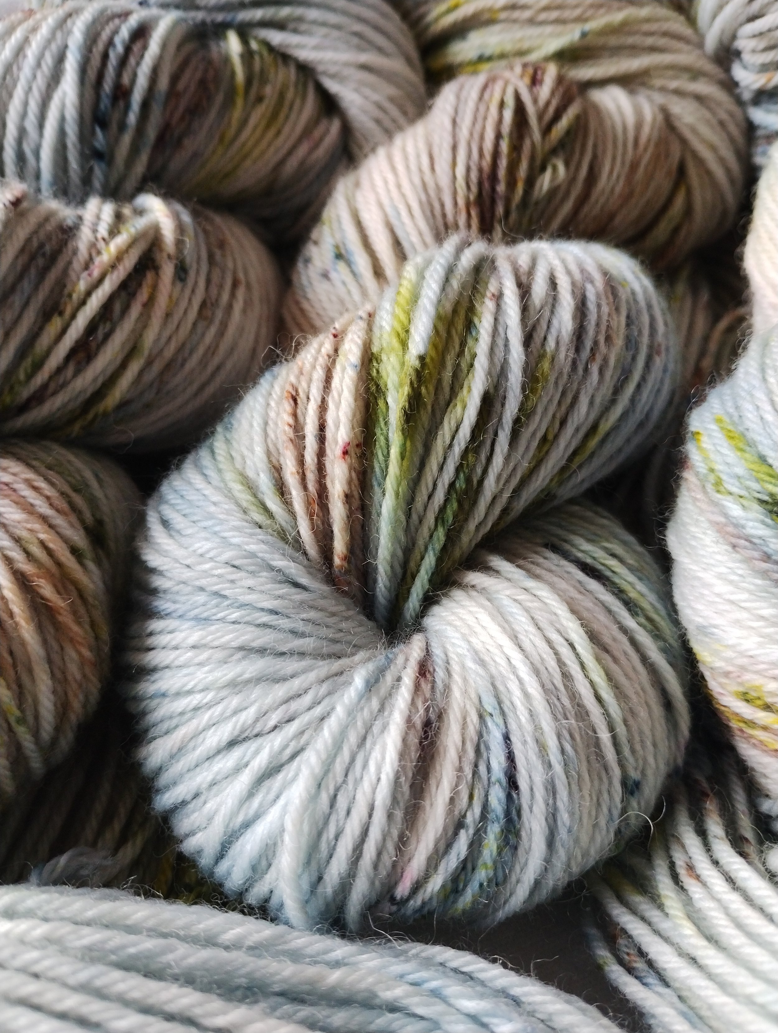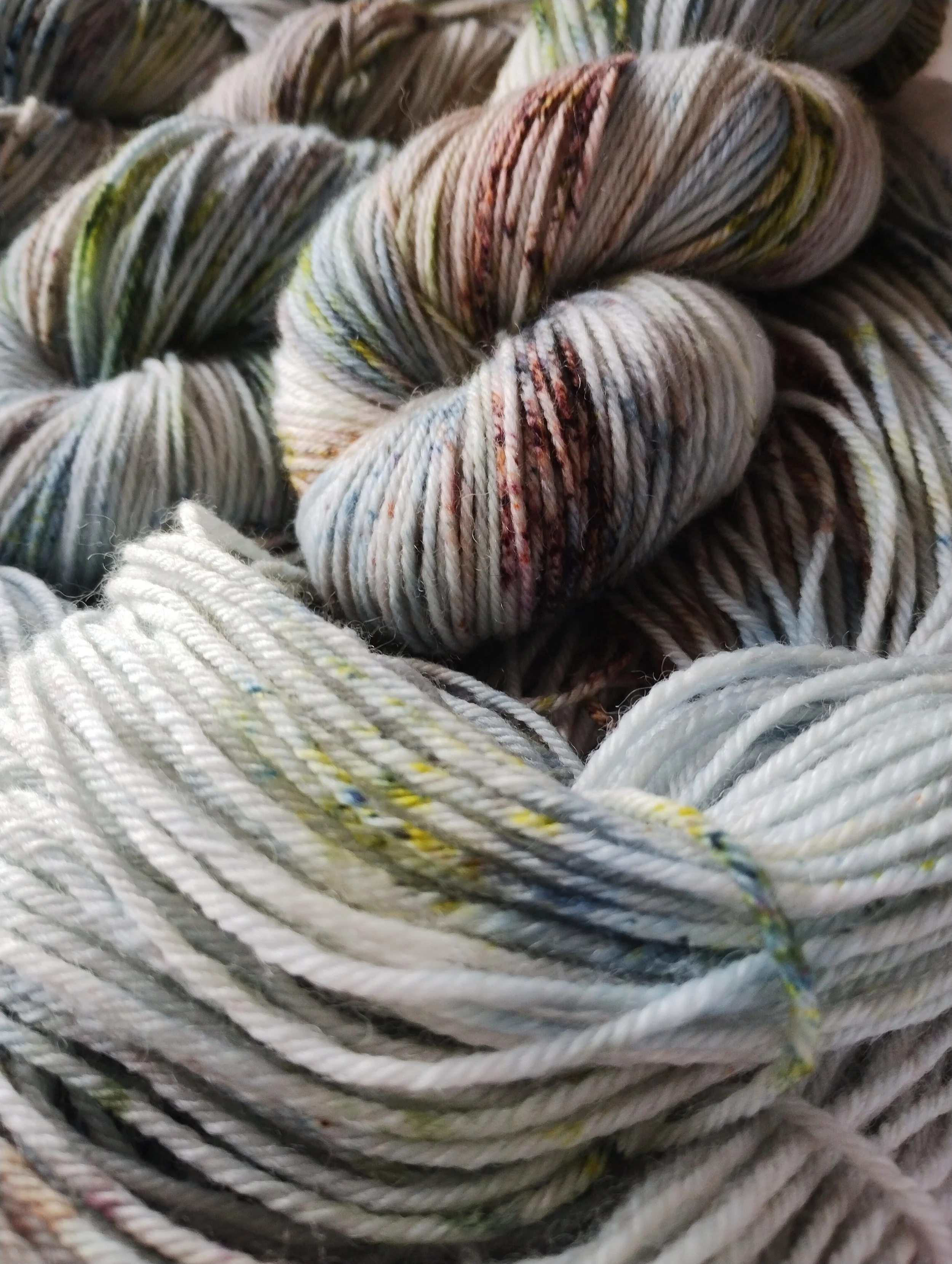 A bouncy, durable but still soft all round sock yarn. This one has a bit more of a traditional lambswool handle but is still suitable for next to skin wear. A perennial favourite, it takes colour well and gives crisp stitch and speckle definition.