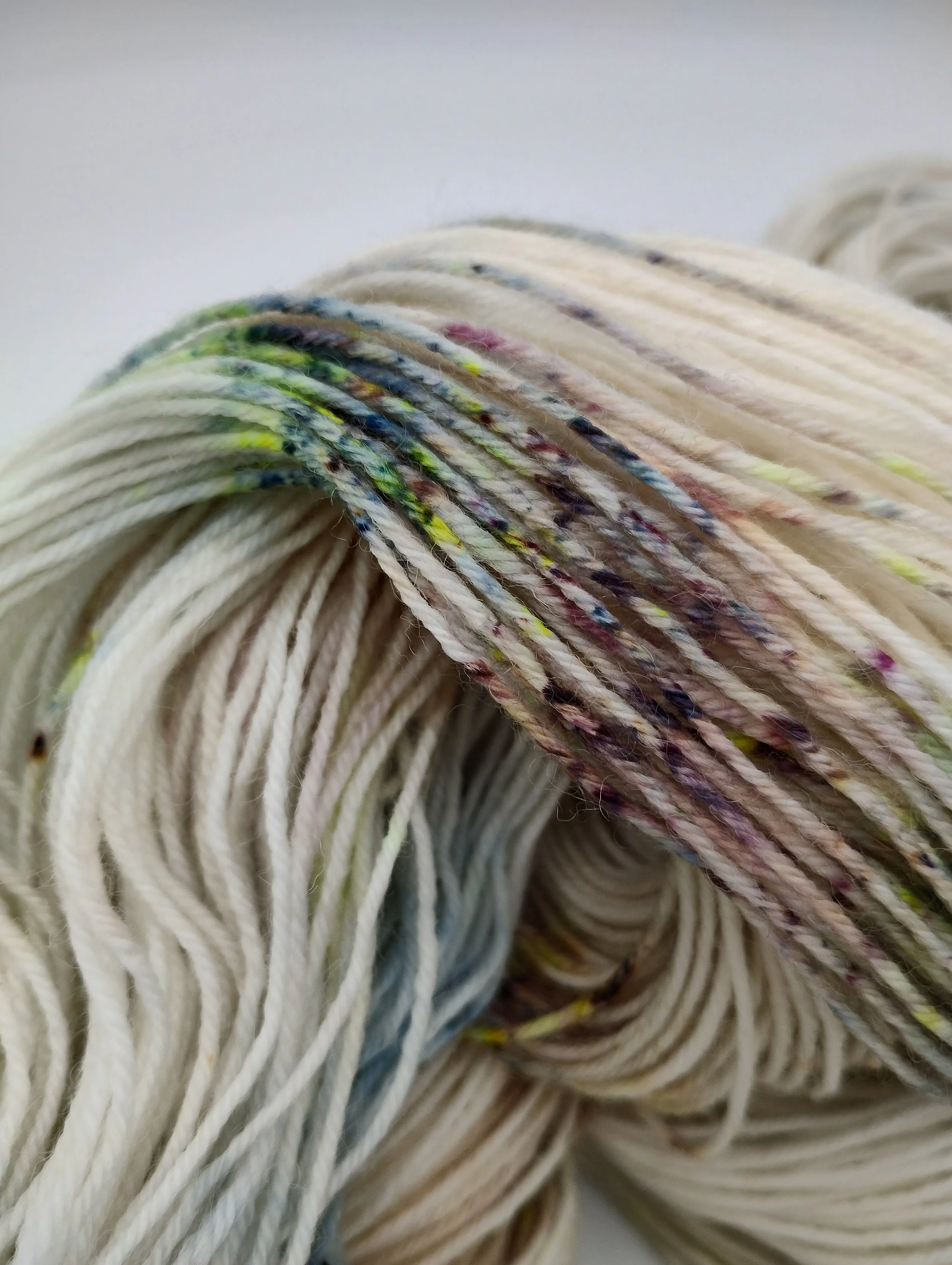 A bouncy, durable but still soft all round sock yarn. This one has a bit more of a traditional lambswool handle but is still suitable for next to skin wear. A perennial favourite, it takes colour well and gives crisp stitch and speckle definition.